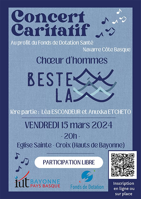 Les étudiants de IUT de Bayonne et du Pays basque sont heureux de vous présenter le concert caritatif au profit du Fonds de Dotation Santé Navarre Côte Basque.