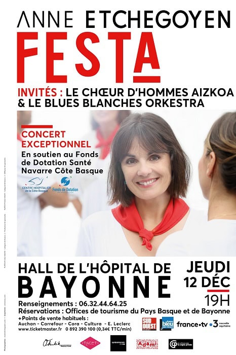 Pour la première fois au Centre Hospitalier de la Côte Basque, Anne Etchegoyen marraine du Fonds de Dotation, donnera un concert exceptionnel le 12 décembre à 19h dans le hall de l’hôpital, avec la participation du chœur d’Hommes Aizkoa et les musiciens du Blues Blanches Orkestra (orchestre de l’hôpital).