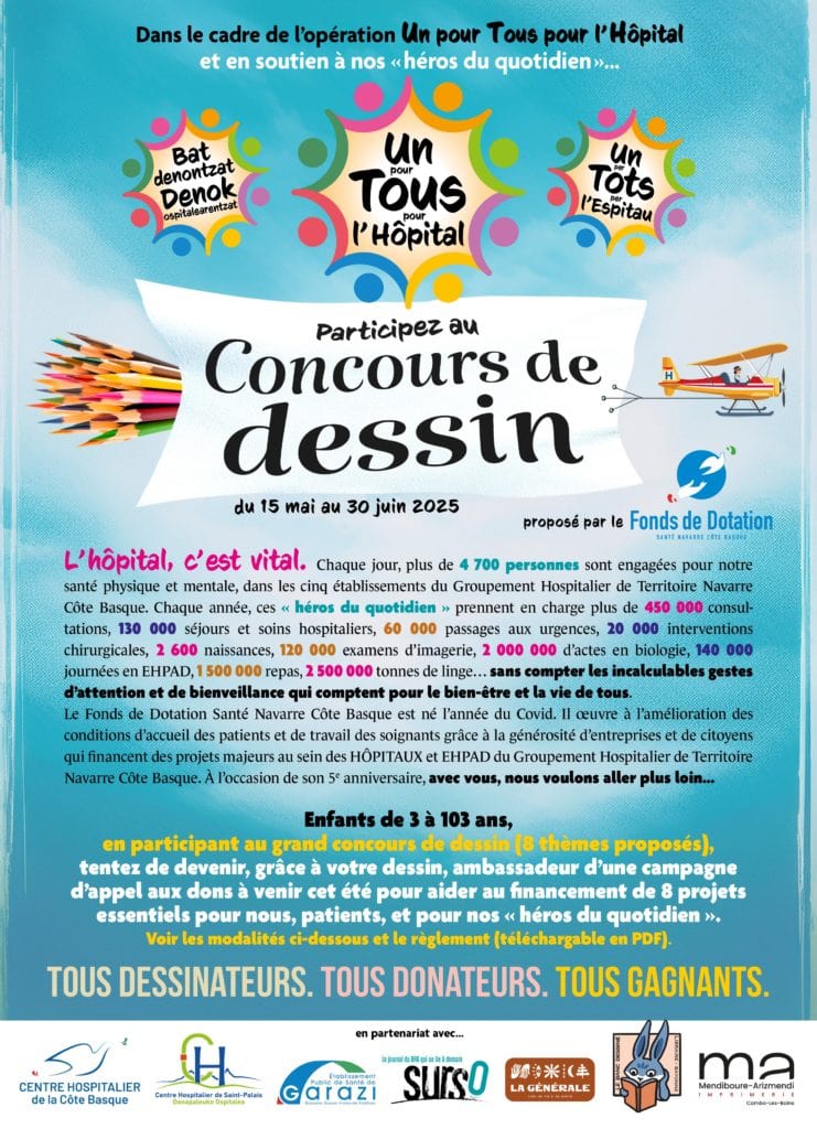 Pour participer à ce concours, vous devrez réaliser une œuvre originale (ou plusieurs) – toutes les techniques graphiques sont autorisées, sans recours à l’intelligence artificielle – de format A5 (15 x 21 cm) ou A4 (21 x 29,7 cm) sur le thème choisi parmi les huit thèmes ci-dessous, thèmes liés aux huit projets portés par le Fonds de Dotation Santé Navarre Côte Basque à destination de différents services du Groupement Hospitalier de Territoire Navarre Côte Basque et des patients de notre territoire.