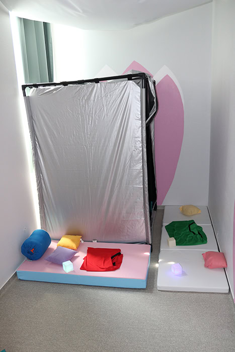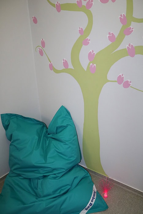 Le projet a consisté à transformer la salle d’attente en espace accueillant et chaleureux, avec l’installation de panneaux lumineux au plafond, la pose de rideaux et l’acquisition de matériel adapté (tente, pouf géant, coussins, tapis, couvertures, sacs de danse, cubes lumineux…).