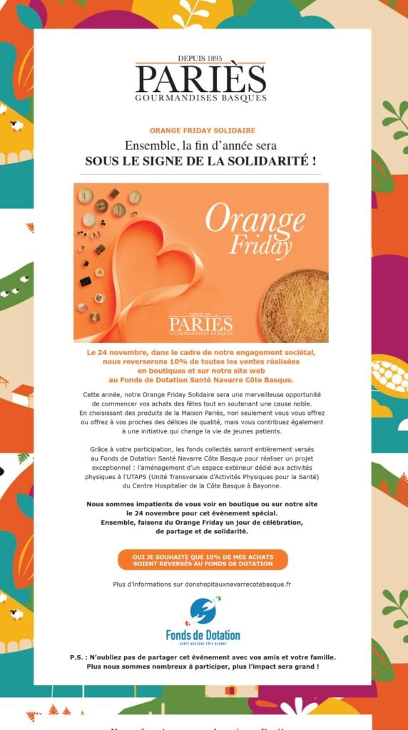 Le 24 novembre, dans le cadre de son engagement sociétal, la Maison Pariès reversera 10% des ventes réalisées dans toutes ses boutiques et sur le site www.paries.fr au Fonds de Dotation Santé Navarre Côte Basque.