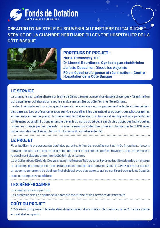 Enfance Création d’une stèle du souvenir au cimetière du talouchet Service de la chambre mortuaire du Centre Hospitalier de la Côte Basque